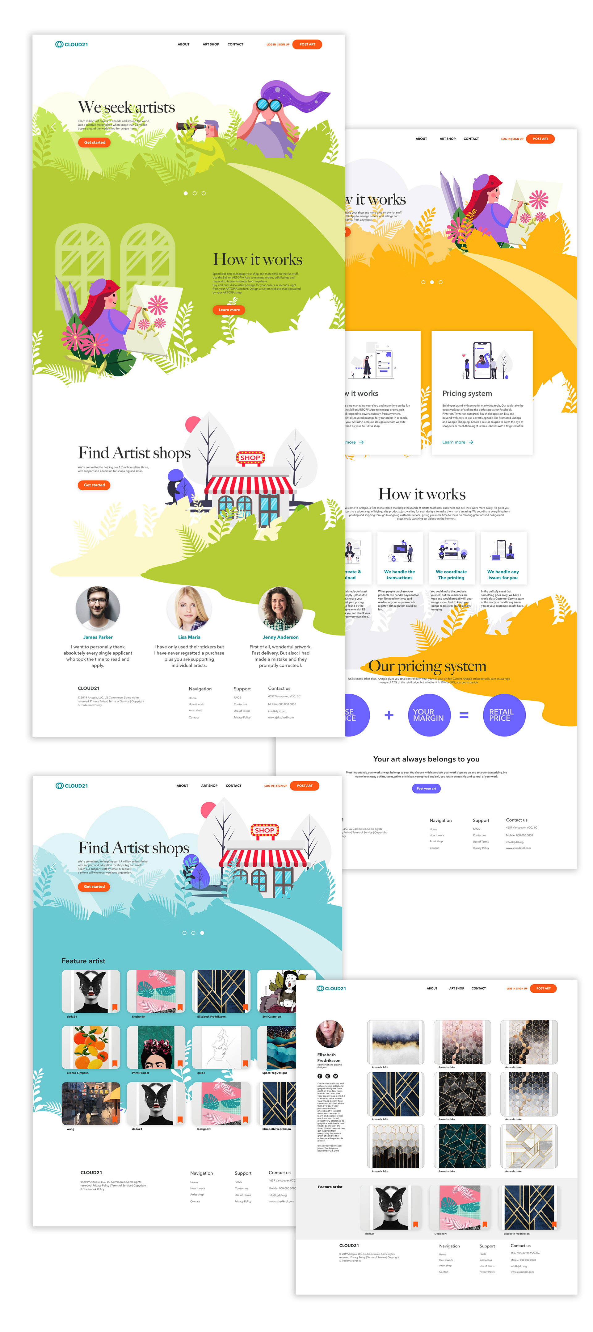 I made the pages include artists’ profile and art works. The artist can sell their artwork through the shop page. I used vivid colors for the illustrations every page, which will be eye-catching.